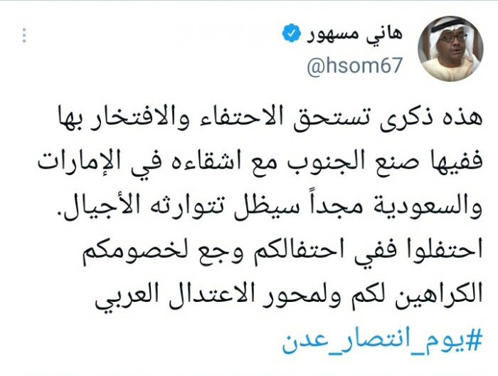وتابع: "احتفلوا، ففي احتفالكم وجع لخصومكم الكارهين لكم ولمحور الاعتدال العربي"، مختتما بهاشتاج: "يوم انتصار عدن".