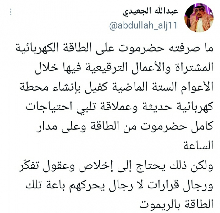 وقال في تغريدة على حسابه بموقع التدوين المصغر تويتر، اليوم إن: "ما صرفته حضرموت على الطاقة الكهربائية المشتراة والأعمال الترقيعية فيها خلال الأعوام الستة الماضية كفيل بإنشاء محطة كهربائية حديثة وعملاقة تلبي احتياجات كامل حضرموت من الطاقة وعلى مدار الساعة".