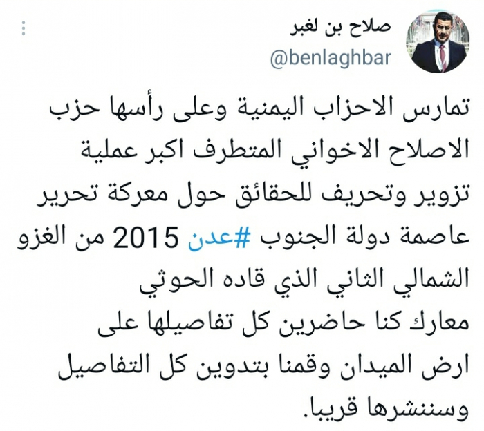 وأشار في تغريدة على حسابه بموقع التدوين المصغر تويتر، اليوم إلى أنه: "تمارس الأحزاب اليمنية وعلى رأسها حزب الإصلاح الإخواني المتطرف أكبر عملية تزوير وتحريف للحقائق حول معركة تحرير عاصمة دولة الجنوب عدن 2015 من الغزو الشمالي الثاني الذي قاده الحوثي".