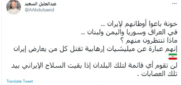 وقال في تغريدة عبر "تويتر" رصدها "المشهد العربي": "خونة باعوا أوطانهم لإيران .. في العراق وسوريا واليمن ولبنان .. ماذا تنتظرون منهم؟".