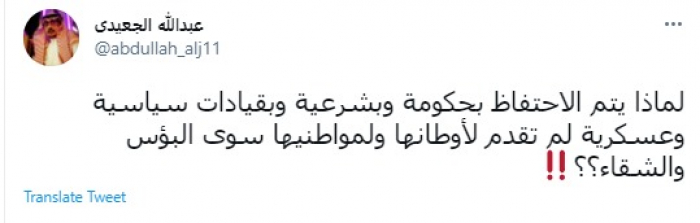 وقال في تغريدة عبر "تويتر" رصدها "المشهد العربي": "لماذا يتم الاحتفاظ بحكومة وبشرعية وبقيادات سياسية وعسكرية لم تقدم لأوطانها ولمواطنيها سوى البؤس والشقاء؟".