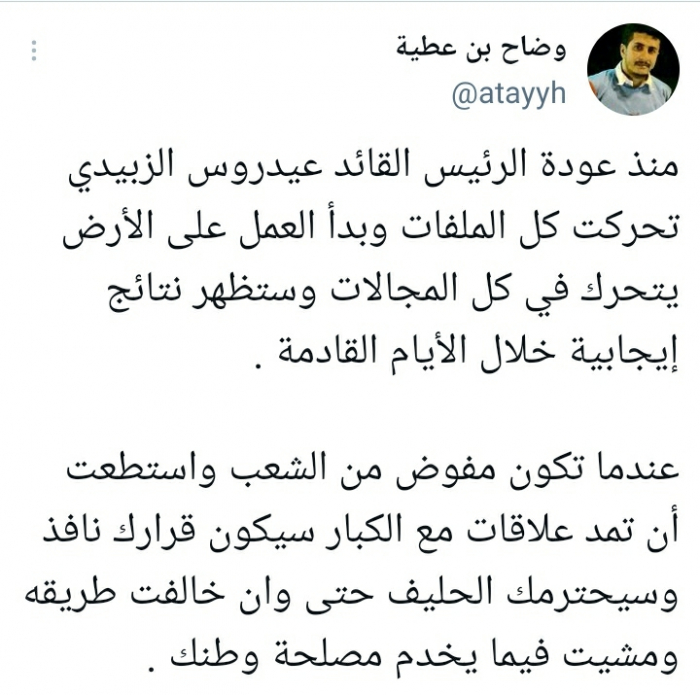 وشدد في تغريدة على حسابه بموقع التدوين المصغر تويتر، اليوم على أنه: "منذ عودة الرئيس القائد عيدروس الزبيدي تحركت كل الملفات وبدأ العمل على الأرض يتحرك في كل المجالات وستظهر نتائج إيجابية خلال الأيام القادمة".
