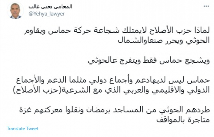 وقال في تغريدة عبر "تويتر" رصدها "المشهد العربي": "لماذا حزب الإصلاح لا يمتلك شجاعة حركة حماس ويقاوم الحوثي ويحرر صنعاء والشمال ويشجع حماس فقط ويتفرج على الحوثي".
