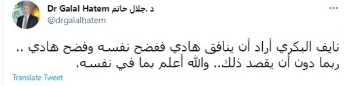 وقال في تغريدة عبر "تويتر" رصدها "المشهد العربي": "نايف البكري أراد أن ينافق هادي ففضح نفسه وفضح هادي .. ربما دون أن يقصد ذلك.. والله أعلم بما في نفسه".