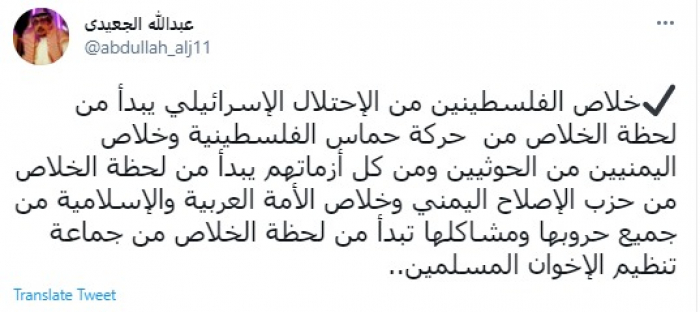 الجعيدي يدعو اليمنيين والفلسطينيين للتخلص من حزب الإصلاح وحماس