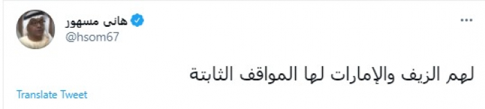 وقال في تغريدة عبر "تويتر" رصدها "المشهد العربي": "لهم الزيف والإمارات لها المواقف الثابتة".