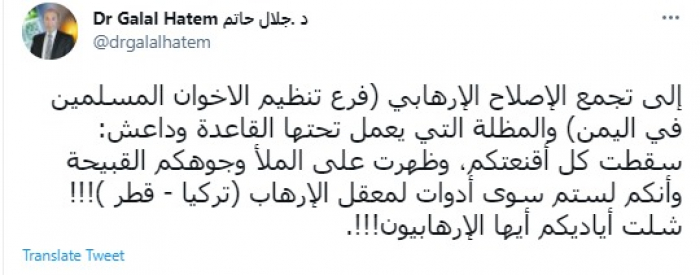 وكتب في تغريدة عبر "تويتر" رصدها "المشهد العربي": "إلى تجمع الإصلاح الإرهابي (فرع تنظيم الإخوان المسلمين في اليمن) والمظلة التي يعمل تحتها القاعدة وداعش: سقطت كل أقنعتكم، وظهرت على الملأ وجوهكم القبيحة وأنكم لستم سوى أدوات لمعقل الإرهاب (تركيا - قطر )".