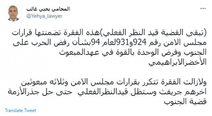 وكتب في تغريدة عبر "تويتر" رصدها "المشهد العربي": "(تبقى القضية قيد النظر الفعلي) هذه الفقرة تضمنتها قرارات مجلس الامن رقم 924 و931 لعام 94 بشأن رفض الحرب على الجنوب وفرض الوحدة بالقوة في عهد المبعوث الأخضر الإبراهيمي".