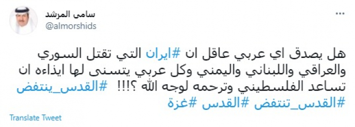وقال في تغريدة عبر "تويتر" رصدها "المشهد العربي": "هل يصدق أي عربي عاقل أن إيران التي تقتل السوري والعراقي واللبناني واليمني وكل عربي يتسنى لها إيذاءه أن تساعد الفلسطيني وترحمه لوجه الله".