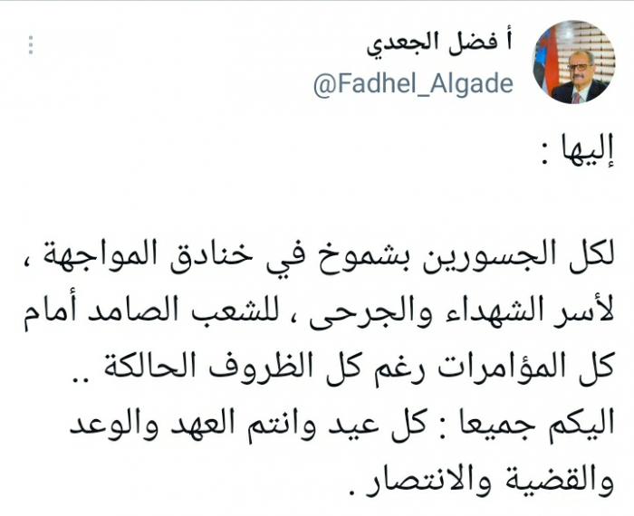 وقال في تغريدة على حسابه بموقع التدوين المصغر تويتر، اليوم: "لكل الجسورين بشموخ في خنادق المواجهة، لأسر الشهداء والجرحى، للشعب الصامد أمام كل المؤامرات رغم كل الظروف الحالكة".