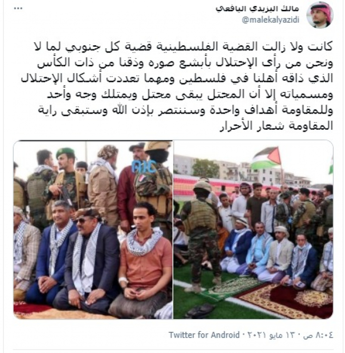 وكتب "اليافعي" تغريدة عبر حسابه بتويتر، رصدها "المشهد العربي": "كانت ولا زالت القضية الفلسطينية قضية كل جنوبي، لما لا ونحن من رأى الاحتلال بأبشع صوره وذقنا من ذات الكأس الذي ذاقه أهلنا في فلسطين".