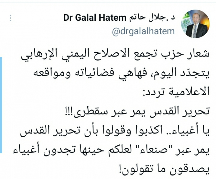 وأكد في تغريدة على حسابه بموقع التدوين المصغر تويتر، اليوم، إن: "شعار حزب تجمع الإصلاح اليمني الإرهابي يتجدّد اليوم، فهاهي فضائياته ومواقعه الإعلامية تردد: تحرير القدس يمر عبر سقطرى!!!".