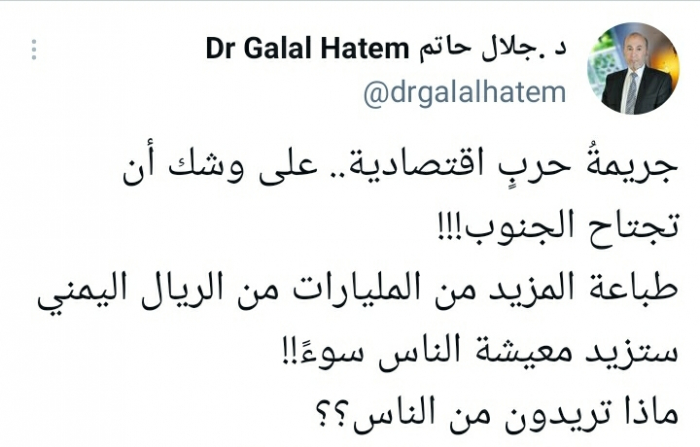 وقال في تغريدة على حسابه بموقع التدوين المصغر تويتر، اليوم إنها: "جريمةُ حربٍ اقتصادية.. على وشك أن تجتاح الجنوب!".