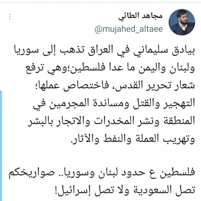 وقال في تغريدة على حسابه بموقع التدوين المصغر تويتر، اليوم: "بيادق سليماني في العراق تذهب إلى سوريا ولبنان واليمن ما عدا فلسطين؛ وهي ترفع شعار تحرير القدس".