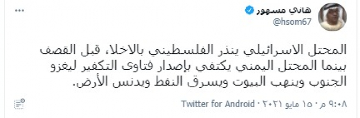 وكتب مسهور، تغردة عبر تويتر، رصدها "المشهد العربي": "المحتل الإسرائيلي ينذر الفلسطيني بالإخلاء، قبل القصف بينما المحتل اليمني يكتفي بإصدار فتاوى التكفير ليغزو الجنوب وينهب البيوت ويسرق النفط ويدنس الأرض".