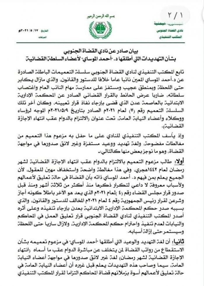 ولفت إلى أنه كان الأحرى بالمدعو أحمد الموساي التقيد بالأنظمة والقوانين، وأن يبادر شخصيًا باحترام القوانين والعمل بأحكامها، وذلك بالاعتذار عن تولي وظيفة النائب العام المُسندة له بموجب قرار مُخالف للقانون.