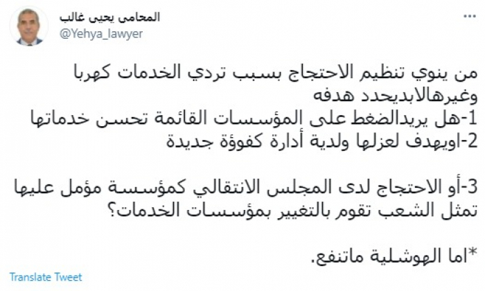 وقال في تغريدة عبر "تويتر" رصدها "المشهد العربي": "من ينوي تنظيم الاحتجاج بسبب تردي الخدمات كهرباء وغيرها لابد يحدد هدفه".