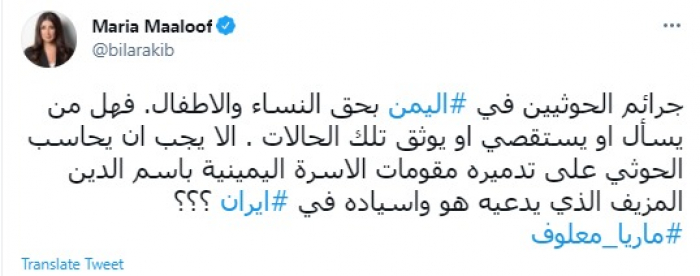قالت الإعلامية اللبنانية ماريا معلوف، اليوم، إن زعيم مليشيات الحوثي الإرهابية عبدالملك الحوثي، دمر مقومات الأسرة اليمنية عبر استخدام الشعارات الدينية الإيرانية المزيفة، مُطالبةً بمحاسبته على تلك الجرائم بحق الأطفال والنساء.