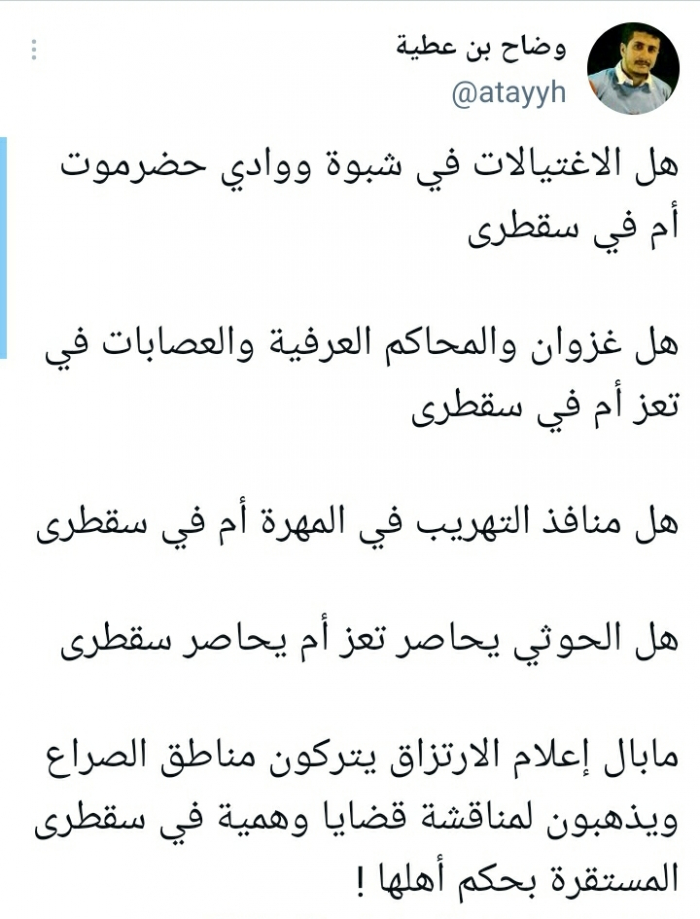 وتساءل في تغريدة على حسابه بموقع التدوين المصغر تويتر، اليوم: "هل الاغتيالات في شبوة ووادي حضرموت أم في سقطرى؟، هل غزوان والمحاكم العرفية والعصابات في تعز أم في سقطرى؟".