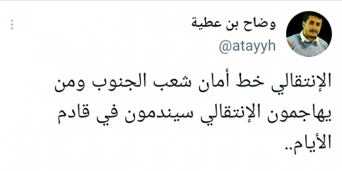 وقال في تغريدة على حسابه بموقع التدوين المصغر تويتر، اليوم إن: "الانتقالي خط أمان لشعب الجنوب"، مشددا على أن: "من يهاجمون الانتقالي سيندمون في قادم الأيام".