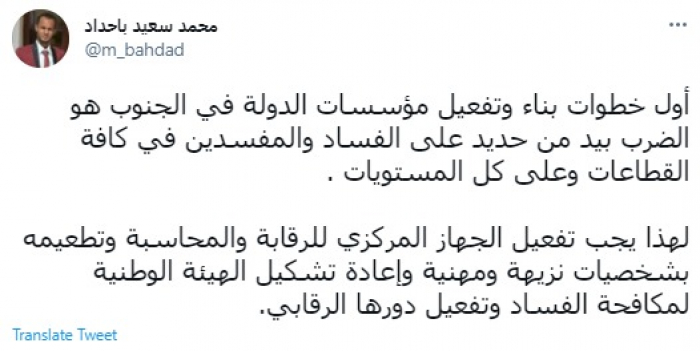 وقال في تغريدة عبر "تويتر" رصدها "المشهد العربي": "أول خطوات بناء وتفعيل مؤسسات الدولة في الجنوب هو الضرب بيد من حديد على الفساد والمفسدين في كافة القطاعات وعلى كل المستويات".