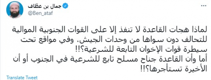 وقال في تغريدة عبر "تويتر" رصدها "المشهد العربي": "لماذا هجمات القاعدة لا تنفذ إلا على القوات الجنوبية الموالية للتحالف دون سواها من وحدات الجيش، وفي مواقع تحت سيطرة قوات الإخوان التابعة للشرعية".
