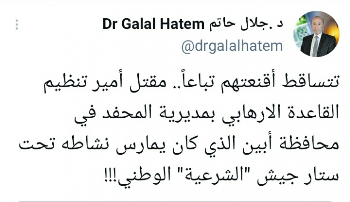 وأكد في تغريدة على حسابه بموقع التدوين المصغر تويتر، اليوم أنه: "تتساقط أقنعتهم تباعا، مقتل أمير تنظيم القاعدة الإرهابي بمديرية المحفد في محافظة أبين الذي كان يمارس نشاطه تحت ستار جيش "الشرعية" الوطني".