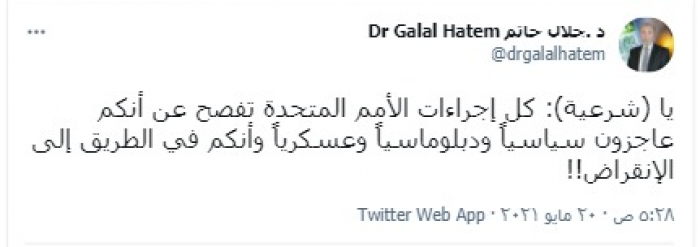 وقال "حاتم" عبر تغريدة بتويتر، رصدها "المشهد العربي": "يا (شرعية): كل إجراءات الأمم المتحدة تفصح عن أنكم عاجزون سياسيا ودبلوماسيا وعسكريا، وأنكم في الطريق إلى الانقراض".