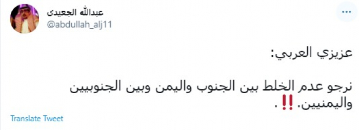 وقال في تغريدة عبر "تويتر" رصدها "المشهد العربي": "عزيزي العربي: نرجو عدم الخلط بين الجنوب واليمن وبين الجنوبيين واليمنيين".