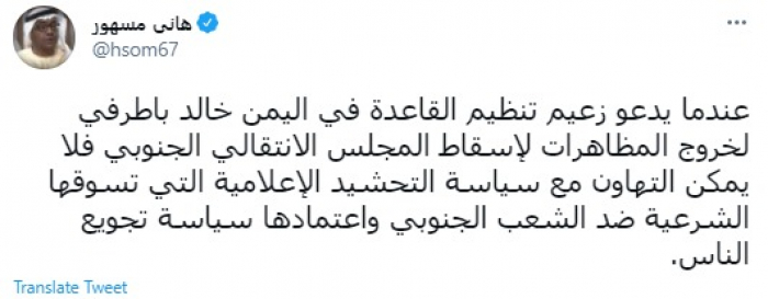 وقال في تغريدة عبر "تويتر" رصدها "المشهد العربي": "عندما يدعو زعيم تنظيم القاعدة في اليمن خالد باطرفي لخروج المظاهرات لإسقاط المجلس الانتقالي الجنوبي فلا يمكن التهاون مع سياسة التحشيد الإعلامية التي تسوقها الشرعية ضد الشعب الجنوبي واعتمادها سياسة تجويع الناس".