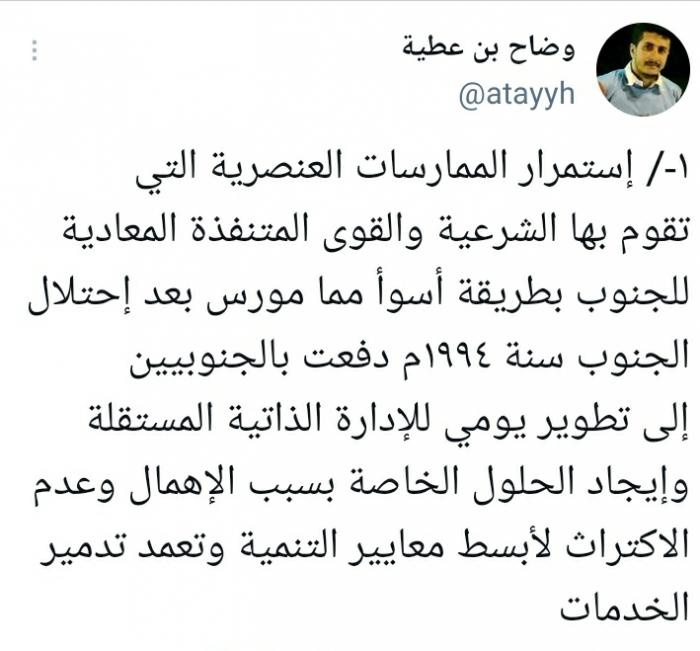 وأشار في تغريدة على حسابه بموقع التدوين المصغر تويتر، اليوم إلى: "استمرار الممارسات العنصرية التي تقوم بها الشرعية والقوى المتنفذة المعادية للجنوب بطريقة أسوأ مما مورس بعد احتلال الجنوب سنة 1994م دفعت بالجنوبيين إلى تطوير يومي للإدارة الذاتية المستقلة".