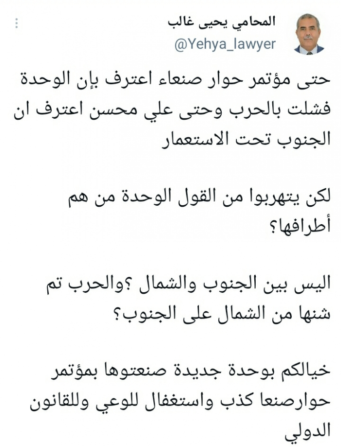 ولفت في تغريدة على حسابه بموقع التدوين المصغر تويتر، اليوم إلى أن: "حتى مؤتمر حوار صنعاء اعترف بأن الوحدة فشلت بالحرب، وحتى علي محسن اعترف أن الجنوب تحت الاستعمار".