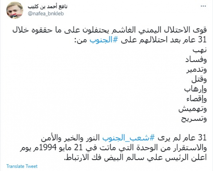 وقال في تغريدة عبر "تويتر" رصدها "المشهد العربي": "قوى الاحتلال اليمني الغاشم يحتفلون على ما حققوه خلال 31 عام بعد احتلالهم الجنوب من: نهب وفساد وتدمير وقتل وإرهاب وإقصاء وتهميش وتسريح".