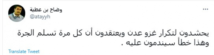 وقال في تغريدة عبر "تويتر" رصدها "المشهد العربي": "يحشدون لتكرار غزو عدن ويعتقدون أن كل مرة تسلم الجرة وهذا خطأ سيندمون عليه".
