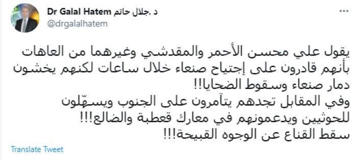 وكتب في تغريدة عبر "تويتر" رصدها "المشهد العربي": "يقول علي محسن الأحمر والمقدشي وغيرهما من العاهات بأنهم قادرون على اجتياح صنعاء خلال ساعات لكنهم يخشون دمار صنعاء وسقوط الضحايا".