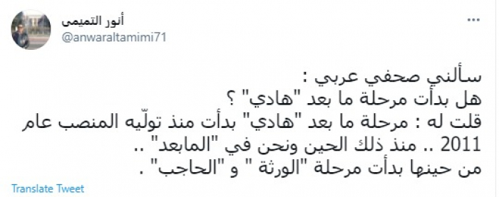 وقال في تغريدة عبر "تويتر" رصدها "المشهد العربي": "سألني صحفي عربي: هل بدأت مرحلة ما بعد هادي؟".
