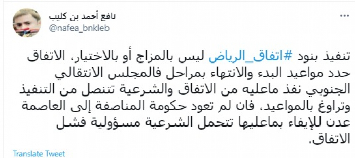 وكتب في تغريدة عبر "تويتر" رصدها "المشهد العربي": "تنفيذ بنود اتفاق الرياض ليس بالمزاج أو بالاختيار".