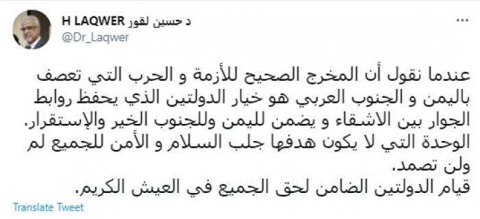 وقال في تغريدة عبر "تويتر" رصدها "المشهد العربي": "عندما نقول أن المخرج الصحيح للأزمة والحرب التي تعصف باليمن والجنوب العربي هو خيار الدولتين الذي يحفظ روابط الجوار بين الأشقاء ويضمن لليمن وللجنوب الخير والاستقرار".