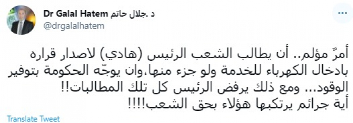 وقال في تغريدة عبر "تويتر" رصدها "المشهد العربي": "أمرٌ مؤلم.. أن يطالب الشعب الرئيس (هادي) لإصدار قراره بإدخال الكهرباء للخدمة ولو جزء منها، وأن يوجّه الحكومة بتوفير الوقود... ومع ذلك يرفض الرئيس كل تلك المطالبات".