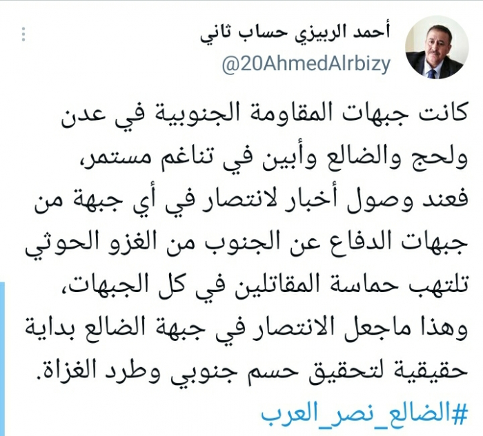 وأشار إلى أن: "هذا ما جعل الانتصار في جبهة الضالع بداية حقيقية لتحقيق حسم جنوبي وطرد الغزاة"، مضيفا أن: "الضالع نصر العرب".