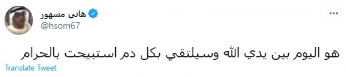 وقال في تغريدة عبر "تويتر" رصدها "المشهد العربي": "هو اليوم بين يدي الله وسيلتقي بكل دم استبيحت بالحرام".