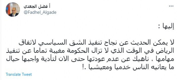 وقال في تغريدة عبر "تويتر" رصدها "المشهد العربي": "لا يمكن الحديث عن نجاح تنفيذ الشق السياسي لاتفاق الرياض في الوقت الذي لا تزال الحكومة مغيبة تماما عن تنفيذ مهامها".