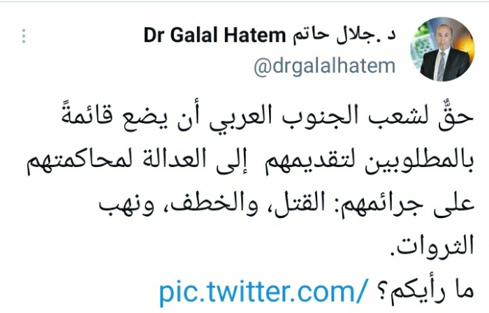وأكد في تغريدة على حسابه بموقع التدوين المصغر تويتر، اليوم أنه: "حقٌّ لشعب الجنوب العربي أن يضع قائمةً بالمطلوبين لتقديمهم إلى العدالة لمحاكمتهم على جرائمهم: القتل، والخطف، ونهب الثروات"، متسائلا: "ما رأيكم؟".