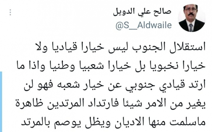 ولفت إلى أنه: "إذا ما ارتد قيادي جنوبي عن خيار شعبه فهو لن يغير من الأمر شيئا"، مضيفا: "فارتداد المرتدين ظاهرة ما سلمت منها الأديان ويظل يوصم بالمرتد".