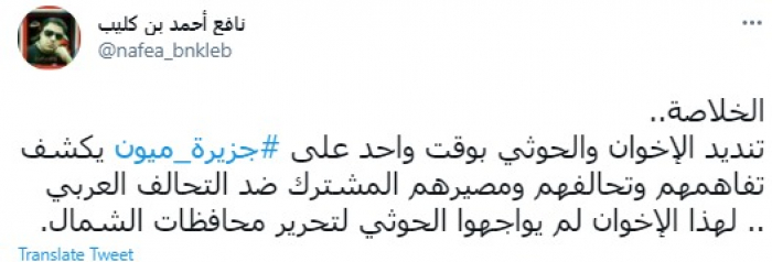 وقال في تغريدة عبر "تويتر" رصدها "المشهد العربي": "الخلاصة.. تنديد الإخوان والحوثي بوقت واحد على جزيرة ميون يكشف تفاهمهم وتحالفهم ومصيرهم المشترك ضد التحالف العربي".
