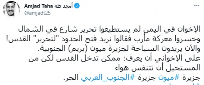وقال في تغريدة عبر "تويتر" رصدها "المشهد العربي": "الإخوان في اليمن لم يستطيعوا تحرير شارع في الشمال وخسروا معركة مأرب فقالوا نريد فتح الحدود لتحرير القدس! والآن يريدون السباحة لجزيرة ميون (بريم) الجنوبية".