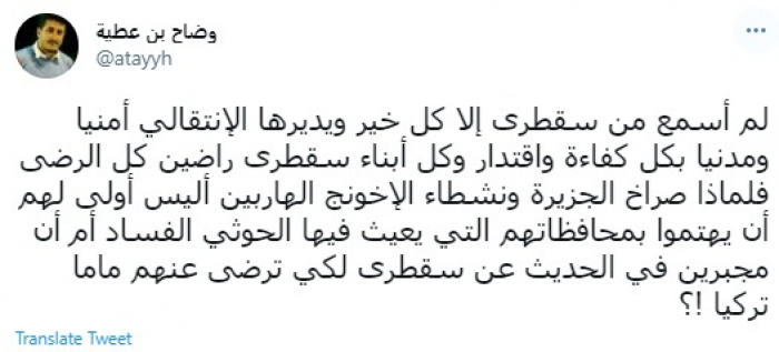 وأضاف: "فلماذا صراخ الجزيرة ونشطاء الإخونج الهاربين أليس أولى لهم أن يهتموا بمحافظاتهم التي يعيث فيها الحوثي الفساد أم أن مجبرين في الحديث عن سقطرى لكي ترضى عنهم ماما تركيا".