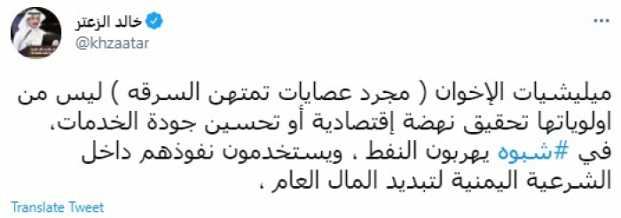 وقال في تغريدة عبر "تويتر" رصدها "المشهد العربي": "مليشيات الإخوان (مجرد عصابات تمتهن السرقة) ليس من أولوياتها تحقيق نهضة اقتصادية أو تحسين جودة الخدمات، في شبوة يهربون النفط، ويستخدمون نفوذهم داخل الشرعية اليمنية لتبديد المال العام".