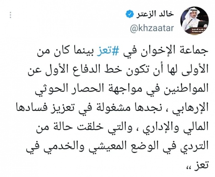 وأوضح في تغريدة على حسابه بموقع التدوين المصغر تويتر، اليوم أن: "جماعة الإخوان في تعز بينما كان من الأولى لها أن تكون خط الدفاع الأول عن المواطنين في مواجهة الحصار الحوثي الإرهابي، نجدها مشغولة في تعزيز فسادها المالي والإداري".