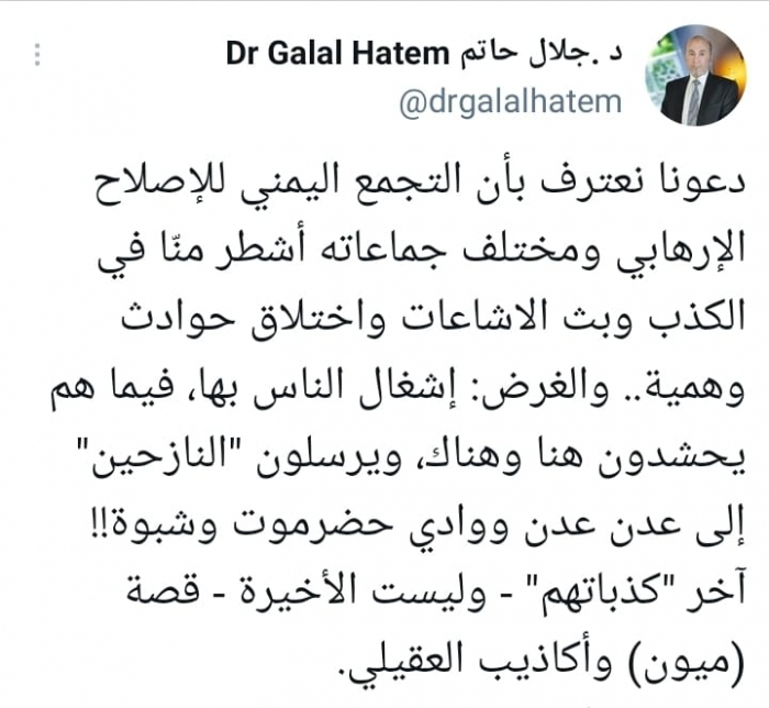 رأى الأكاديمي الجنوبي الدكتور جلال حاتم، رئيس جامعة أم القيوين الإماراتية، أن حزب التجمع اليمني للإصلاح الإخواني، يبث الشائعات لشغل المواطنين عن تهجير النازحين إلى الجنوب.